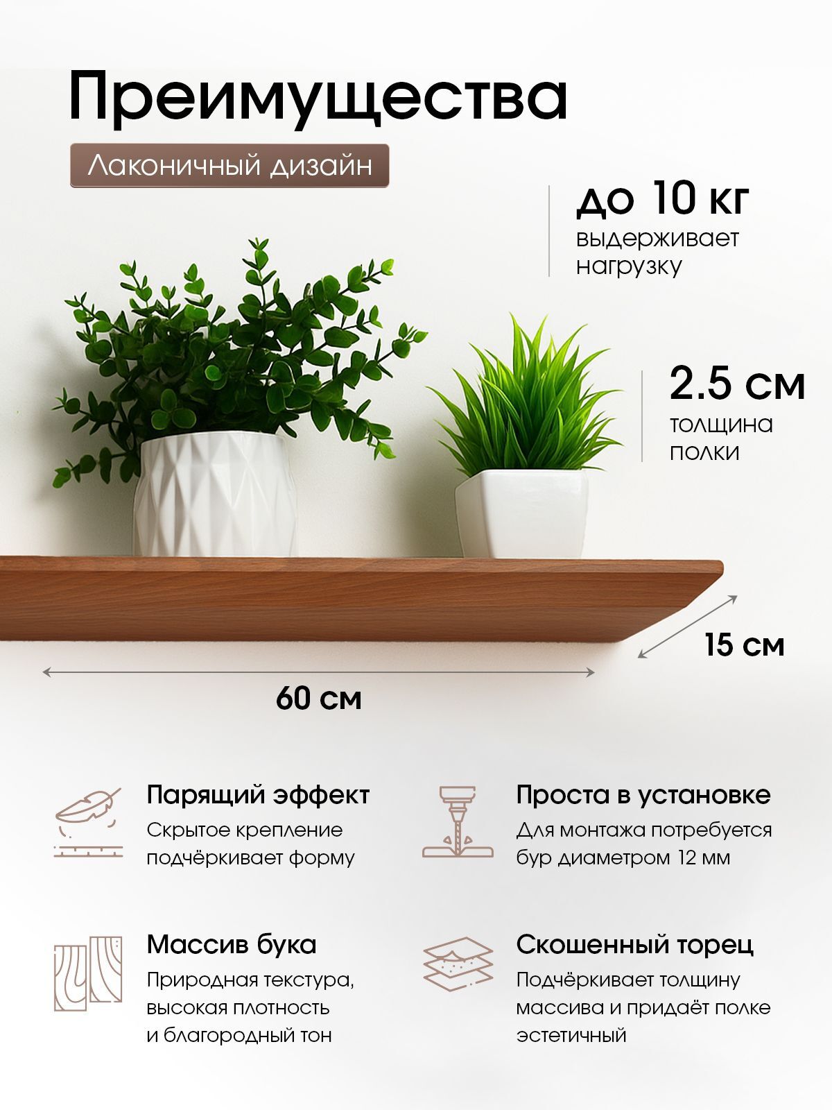 Настенная полка из массива дерева станет идеальным дополнением для вашего интерьера. Эта деревянная полочка подходит для установки в прихожую, кухню, ванную, спальню или комнату, добавляя стиль и функциональность в любое пространство. Изготовленная из прочного бука, она обеспечивает надежную поддержку и долговечность.
