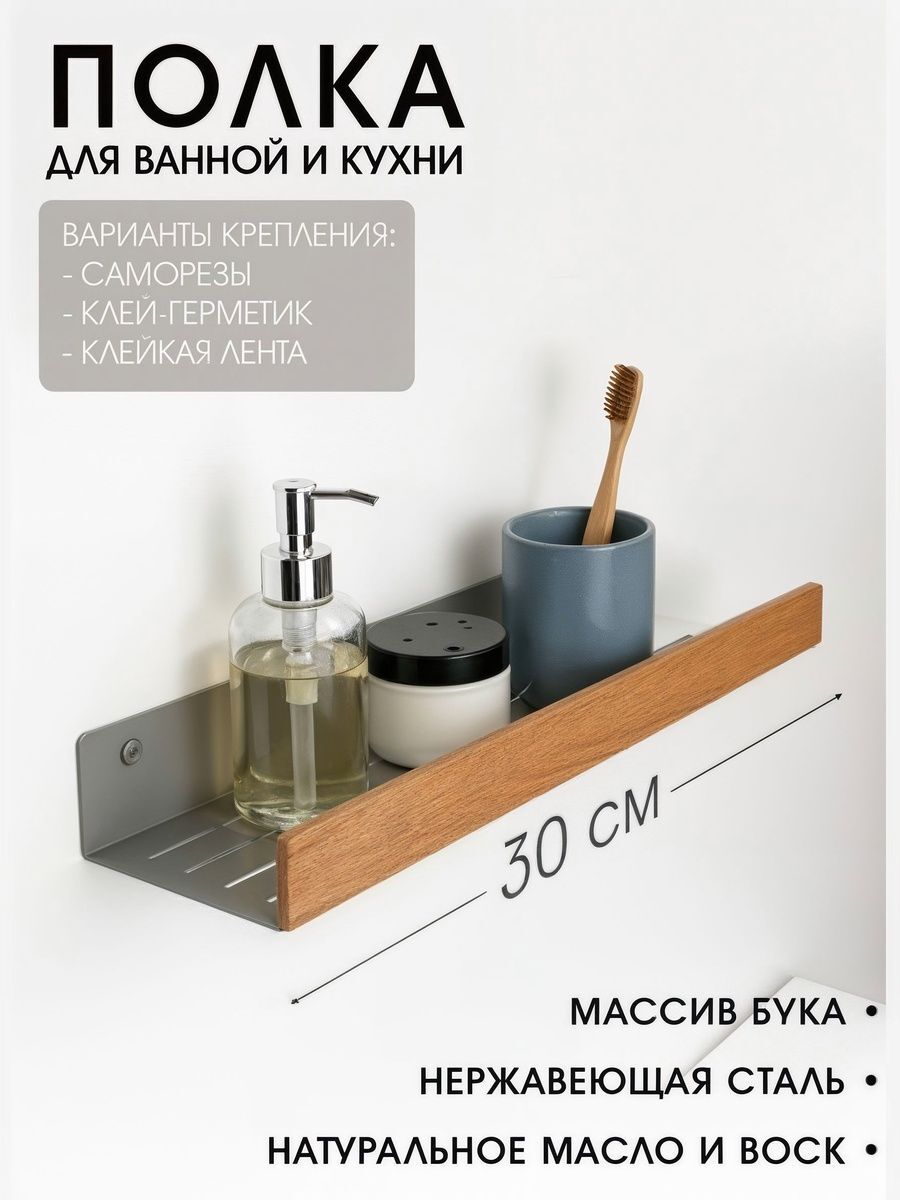 Полка состоит из двух частей – металлической и деревянной декоративной панельки. Металлическая часть изготовлена из нержавеющей стали AISI430 и покрыта порошковой краской. Такая технология полностью исключает возникновение коррозии. Деревянные панельки изготавливаются из массива бука с разными оттенками и покрыты воском, защищающим дерево от влаги.