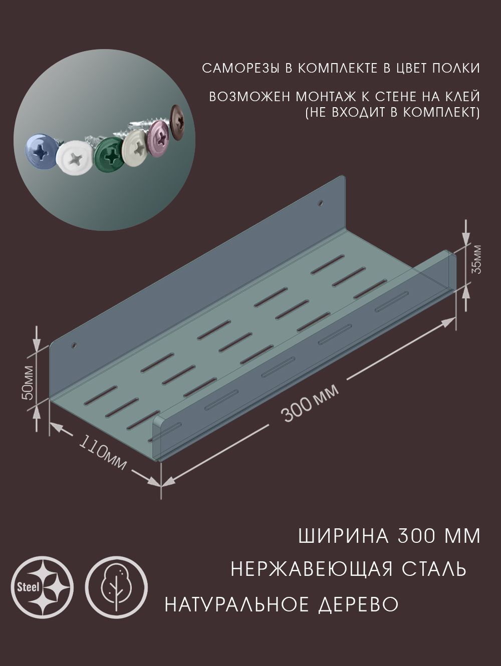 В комплект полки входят саморезы под ее цвет.